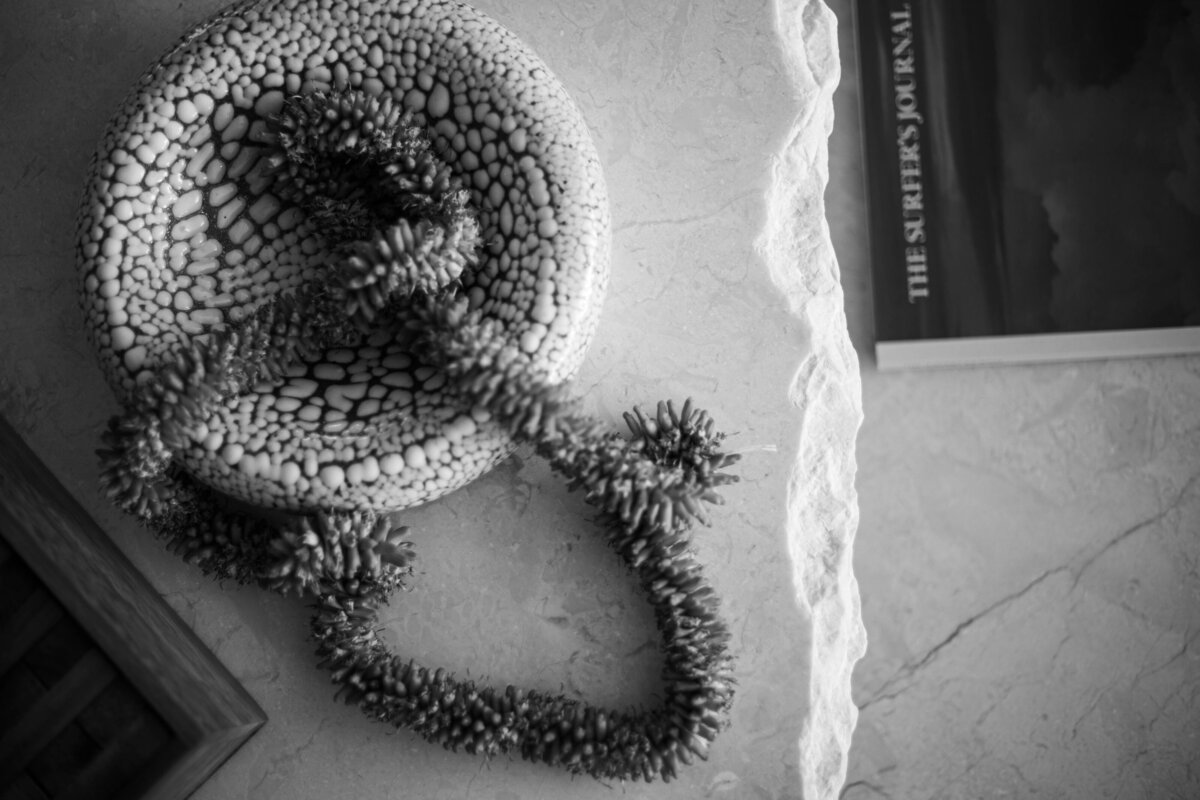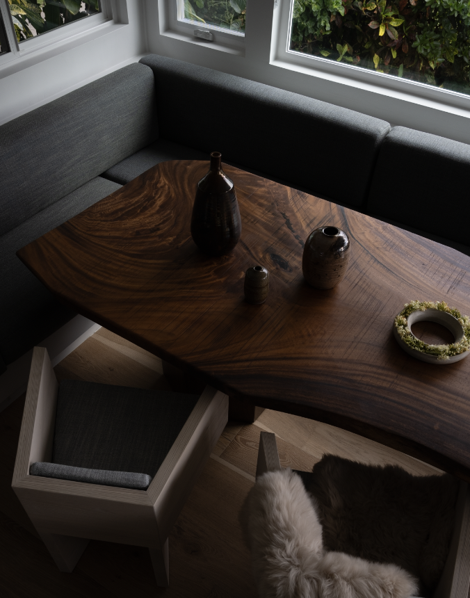 The extra-large dining table serves as the central gathering point of the home, designed to accommodate both family dinners and larger entertaining. Crafted from a single slab of Monkeypod wood, an abundant and invasive species in Hawaiʻi, the piece highlights the natural beauty of local materials. A softly worked organic edge offers a smooth, welcoming touch, while the preserved saw marks from the milling process introduce a raw, handcrafted quality. This balance between refinement and authenticity results in a table that embodies the spirit of Hawaiʻi, inviting connection, shared meals, and lasting memories.