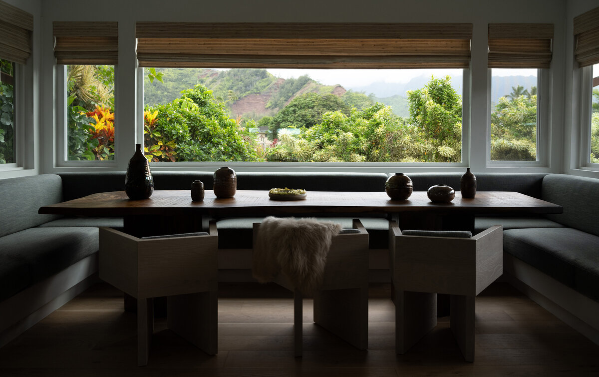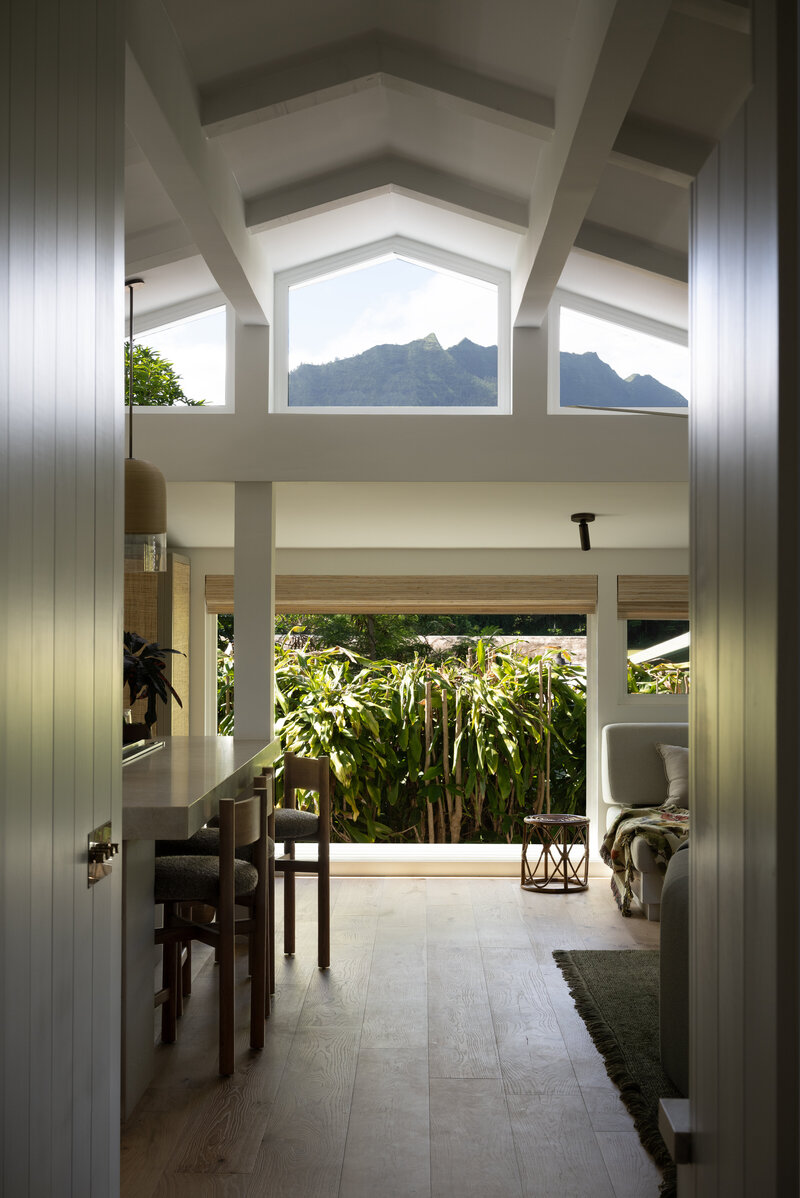A 1970's Hanalei Bay Beach Bungalow tucked away on a lush private lot, with direct views of the adjacent Hihimanu mountain ridge. This residence was renovated with the intention of celebrating its connection to the surrounding landscape, fostering a gathering space that could accommodate the client's large family and potential vacation renters, and to create a home that feels relaxed yet elevated, rooted in its rich history yet contemporary in its approach.